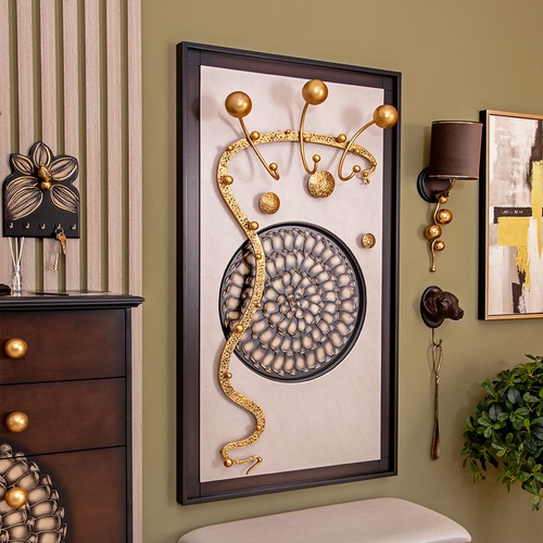Bogacho Вешалка настенная Heri коричневая 3 крючка с декоративным панно и кованым элементом бронзового цвета ручная работа