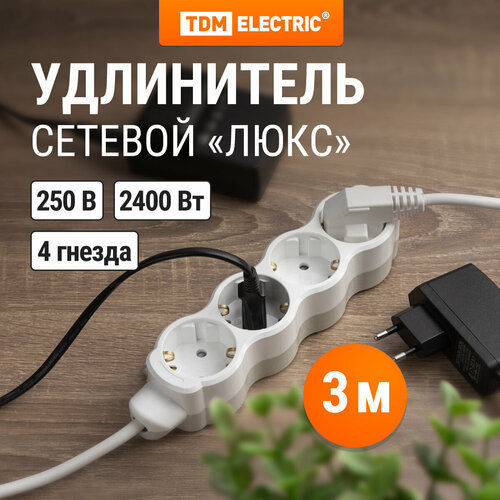 TDM Electric Удлинитель бытовой Люкс 4 гнезда, 3 м, с/з, с з/ш, ПВС 3х0,75 мм2, 10 А, 250 В, 2400 Вт У1-42050, цена за 1 шт